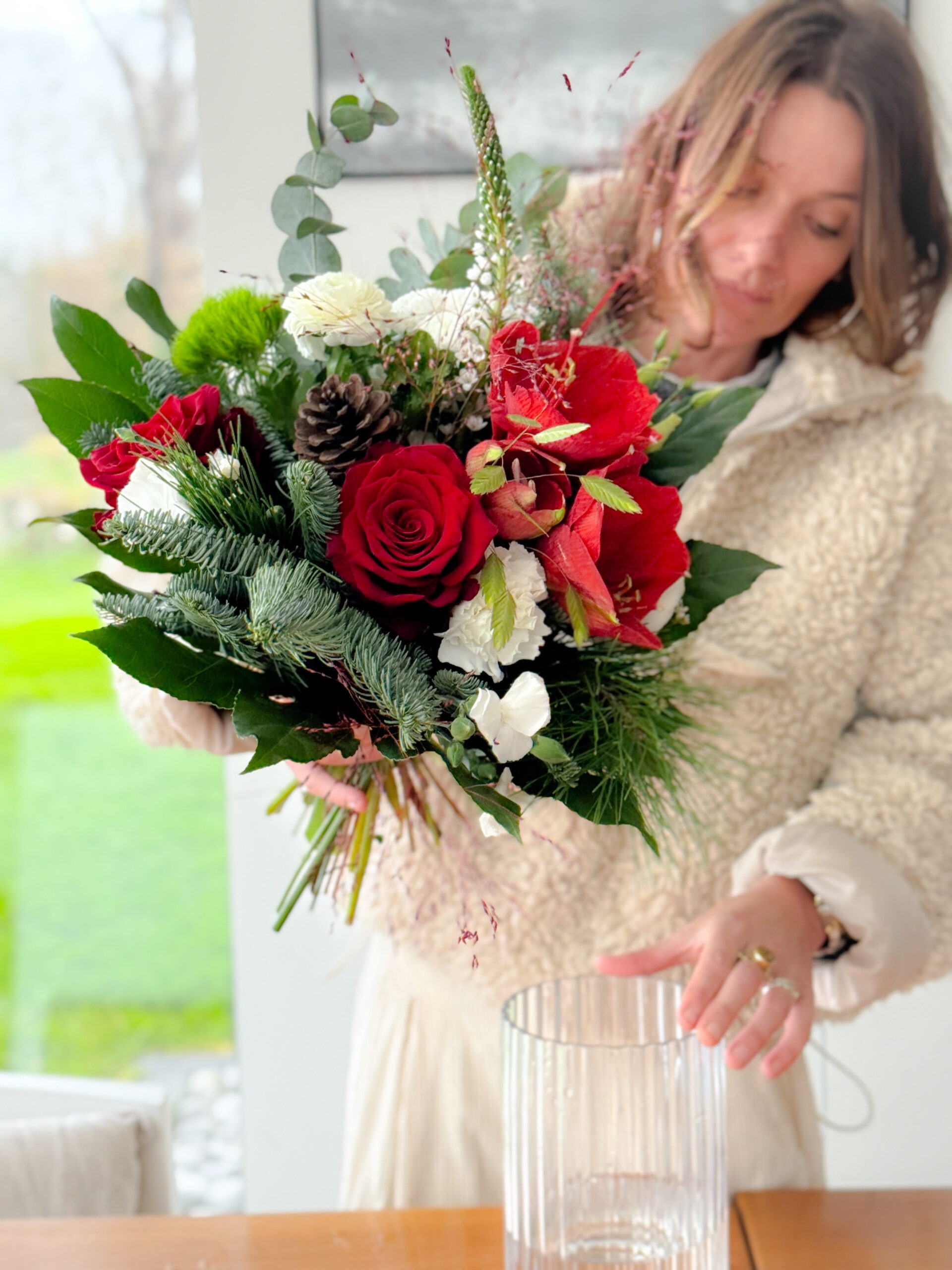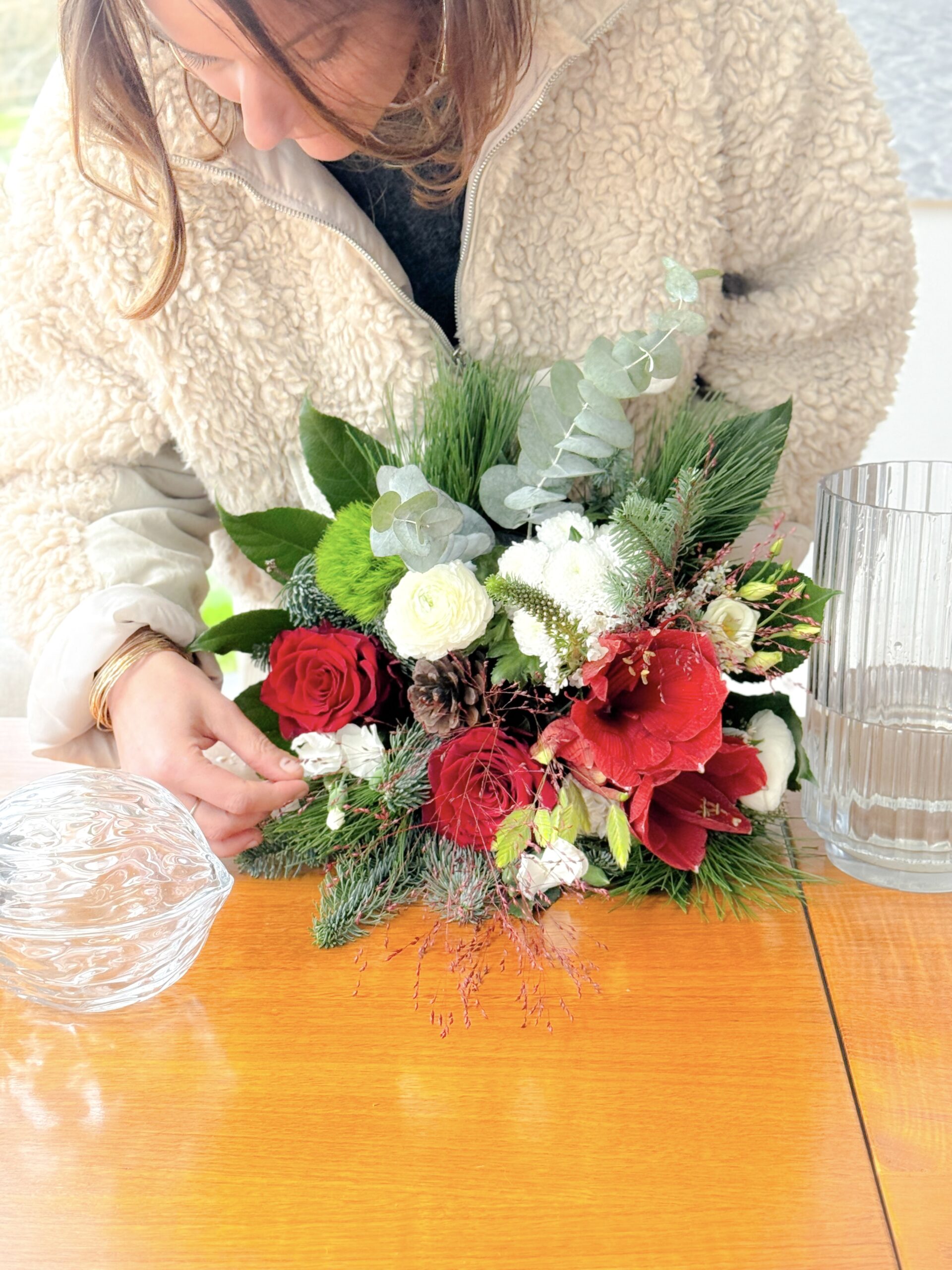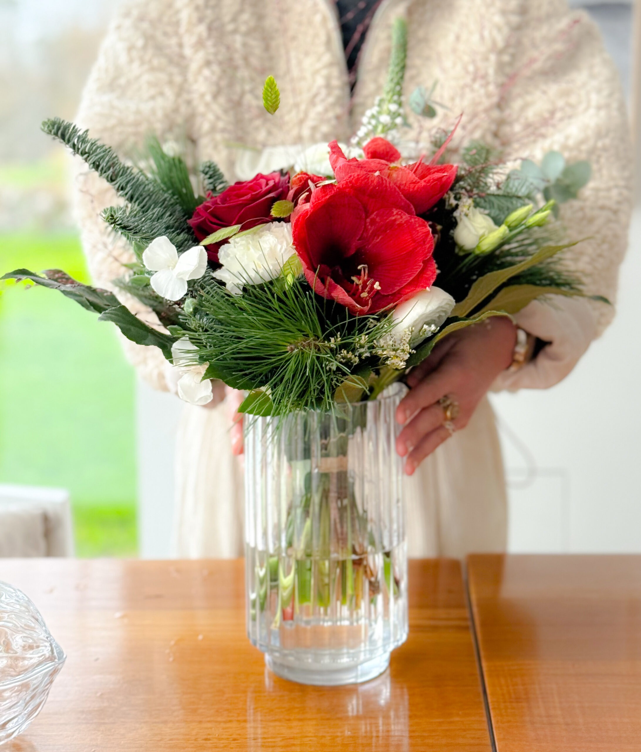 Un bouquet lumineux aux rouges profonds et blancs éclatants, relevé de feuillages hivernaux. Parfait pour apporter une note chaleureuse et féérique à vos fêtes.